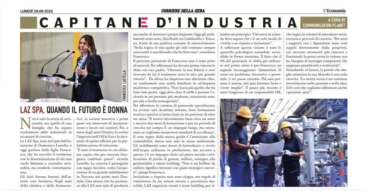 L’inserto Capitane d’Industria de “Il Corriere della Sera” ha ospitato Francesca Lastella per raccontare l’evoluzione di LAZ Spa: dalle origini negli anni ’70 alla realtà odierna, che punta su innovazione, sostenibilità, inclusione e formazione.